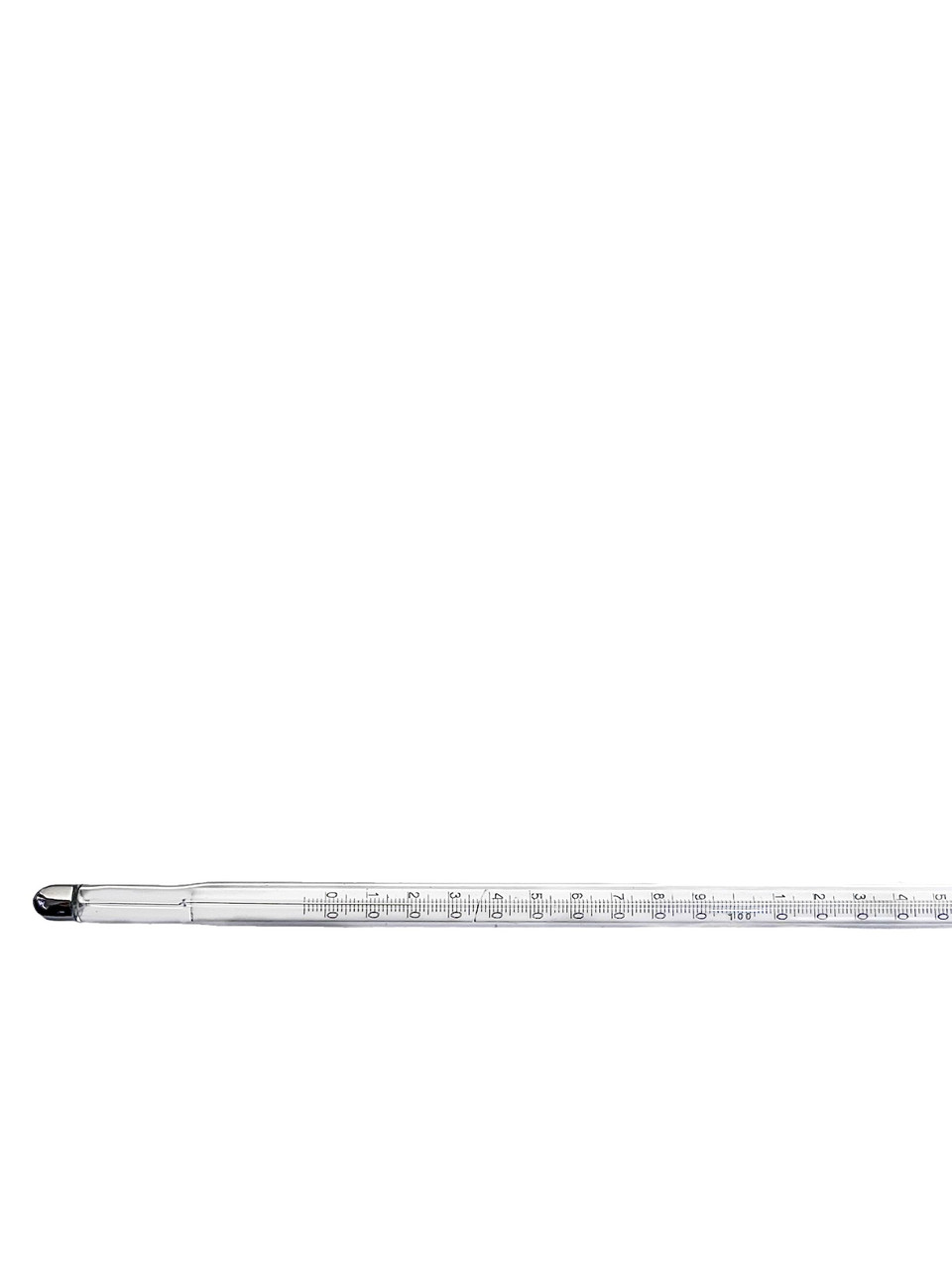 Термометр - являє собою вимірювальний прилад для визначення температури. Він використовує ртуть, яка розширюється або стискається залежно від температури. Цей термометр не має шліфа, що означає відсутність спеціального виступу на нижньому кінці для легкості введення в пробірку або інший контейнер.